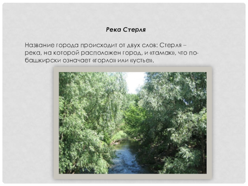 которой расположен город, и «тамак», что по-башкирски означает «горло» или «устье».