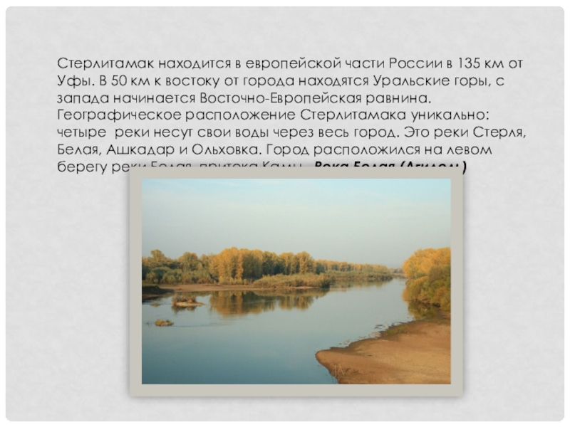 Слайд 3Стерлитамак находится в европейской части России в 135 км от Уфы.