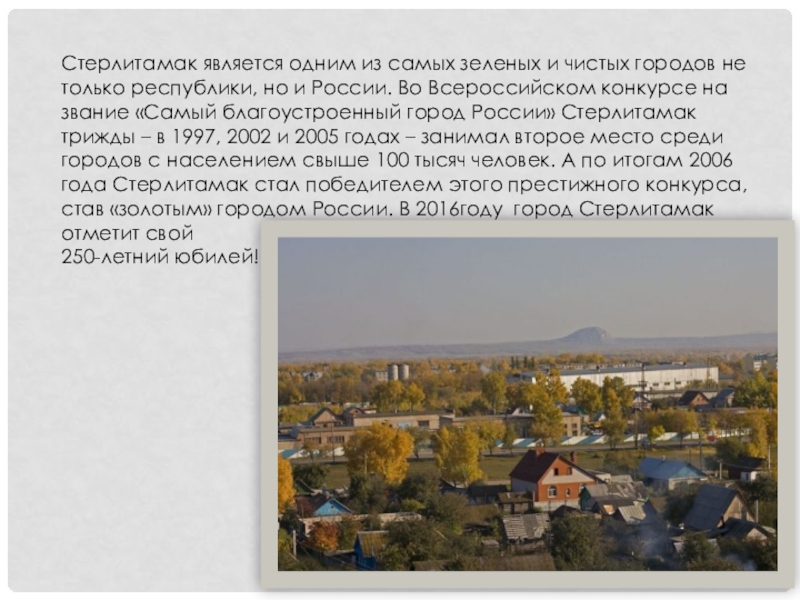 республики, но и России. Во Всероссийском конкурсе на звание «Самый благоустроенный город России» Стерлитамак трижды – в 1997, 2002 и 2005 годах – занимал второе место среди городов с населением свыше 100 тысяч человек. А по итогам 2006 года Стерлитамак стал победителем этого престижного конкурса, став «золотым» городом России. В 2016году город Стерлитамак отметит свой