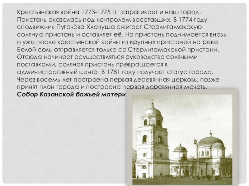 контролем восставших. В 1774 году сподвижник Пугачёва Хлопуша сжигает Стерлитамакскую соляную пристань и оставляет её. Но пристань поднимается вновь и уже после крестьянской войны из крупных пристаней на реке Белой соль отправляется только со Стерлитамакской пристани. Отсюда начинает осуществляться руководство соляными поставками, соляная пристань превращается в административный центр. В 1781 году получает статус города. Через восемь лет построена первая деревянная церковь, позже принят план города и построена первая деревянная мечеть. Собор Казанской божьей матери