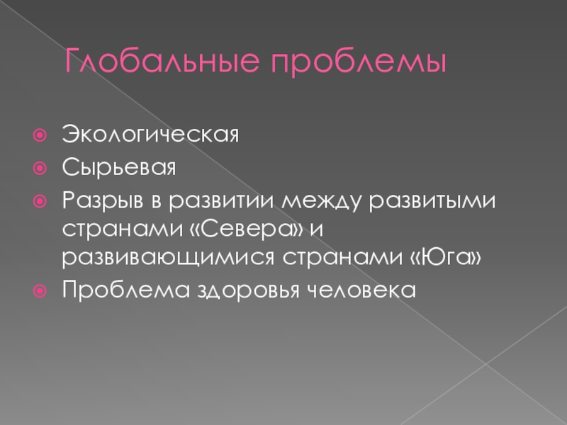 Глобальные проблемыЭкологическаяСырьеваяРазрыв в развитии между развитыми странами «Севера» и развивающимися странами «Юга»Проблема здоровья человека