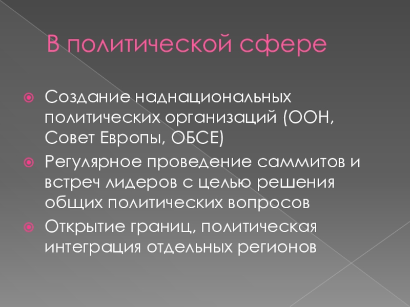 В политической сфереСоздание наднациональных политических организаций (ООН, Совет Европы, ОБСЕ)Регулярное проведение саммитов и встреч лидеров с целью