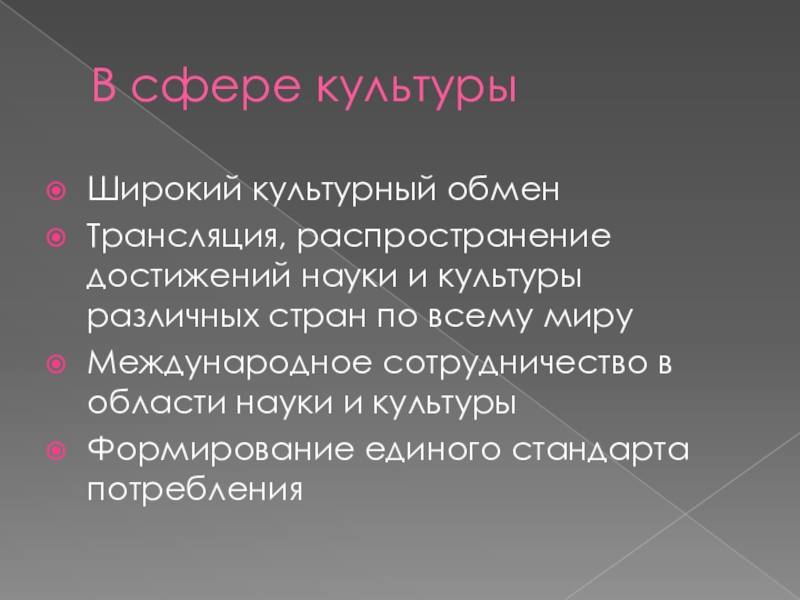 В сфере культурыШирокий культурный обменТрансляция, распространение достижений науки и культуры различных стран по всему мируМеждународное сотрудничество в