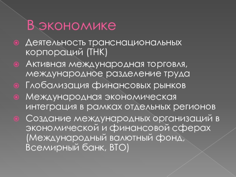 В экономикеДеятельность транснациональных корпораций (ТНК)Активная международная торговля, международное разделение трудаГлобализация финансовых рынковМеждународная экономическая интеграция в рамках отдельных
