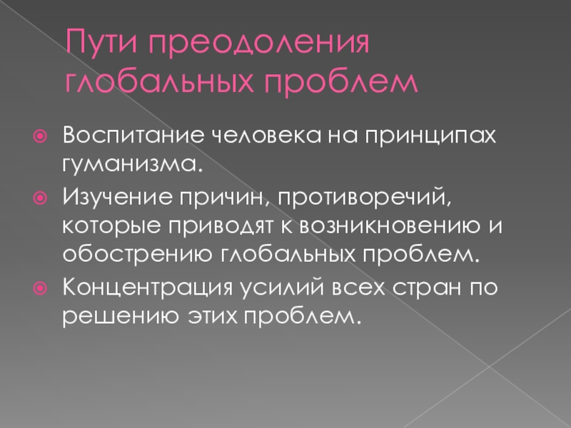Пути преодоления глобальных проблемВоспитание человека на принципах гуманизма.Изучение причин, противоречий, которые приводят к возникновению и обострению глобальных
