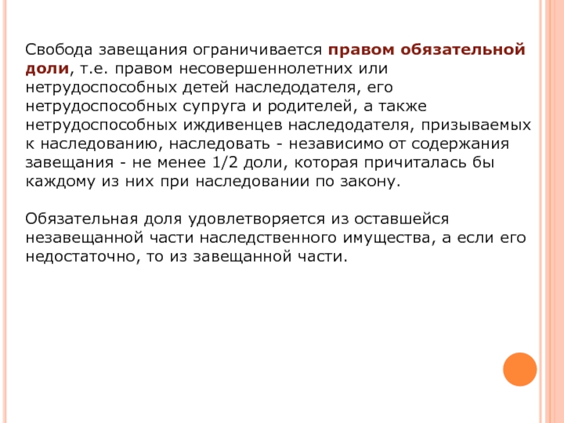 В завещании можно любым образом определить доли наследников. Если имущество завещано двум или нескольким наследникам без указания долей либо указания того, какие входящие в состав наследства вещи или права кому из них предназначены, то считается, что имущество завещано наследникам в равных долях.