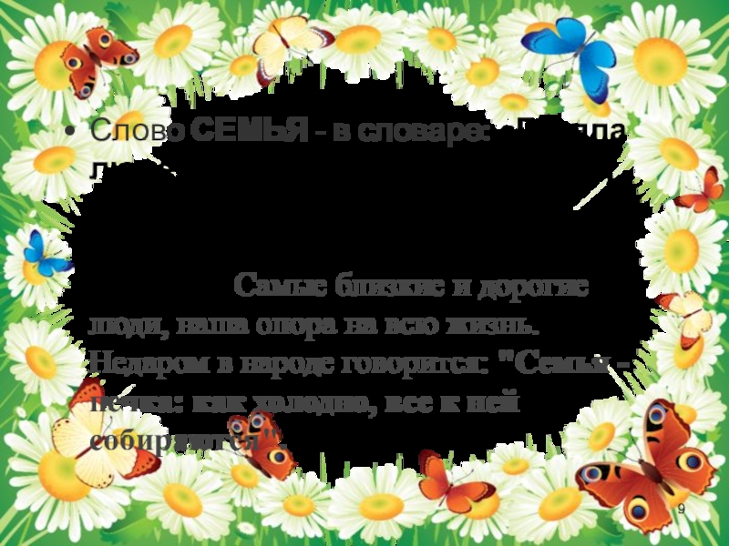 родственников, живущих вместе». Самые близкие и дорогие люди, наша опора на всю жизнь. Недаром в народе говорится: "Семья - печка: как холодно, все к ней собираются".