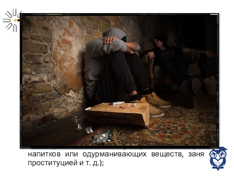 посягающие на здоровье, санитарно-эпидемическое благополучие населения и общественную нравственность (потребление наркотических средств, вовлечение несовершеннолетних в употребление спиртных напитков или одурманивающих веществ, занятие проституцией и т. д.);