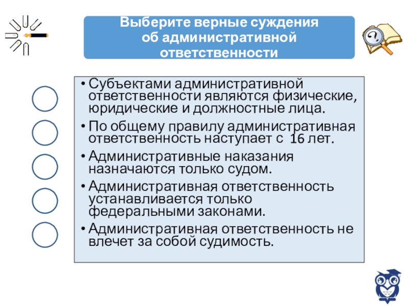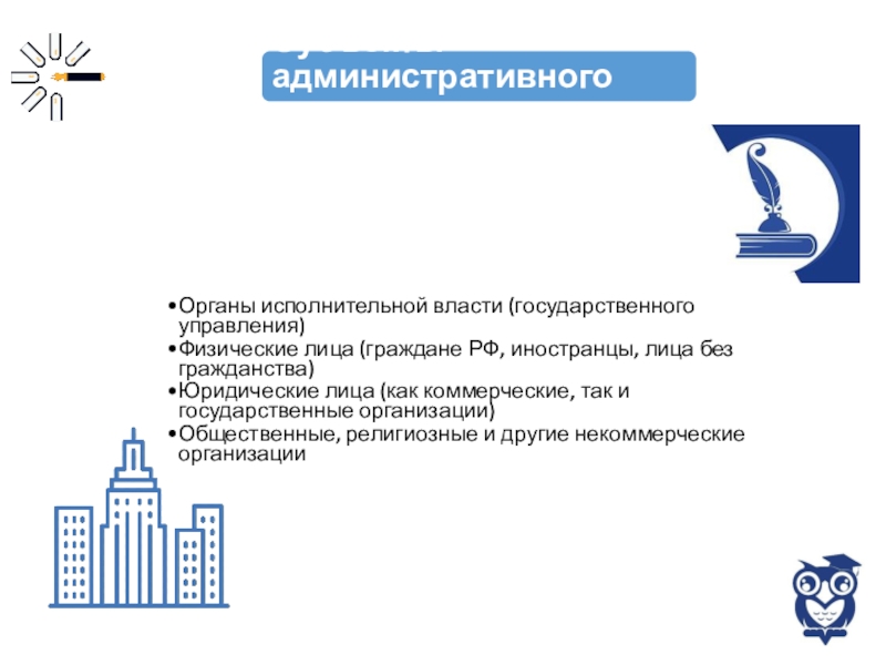 Слайд 38Субъектами административной ответственности являются физические, юридические и должностные лица.