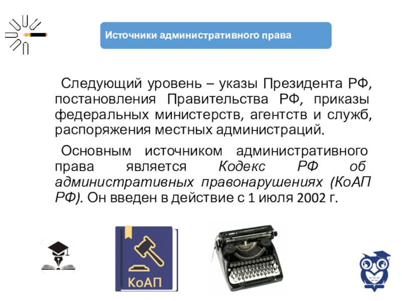 Основным источником административного права является Кодекс РФ об административных правонарушениях (КоАП РФ). Он введен в действие с 1 июля 2002 г.