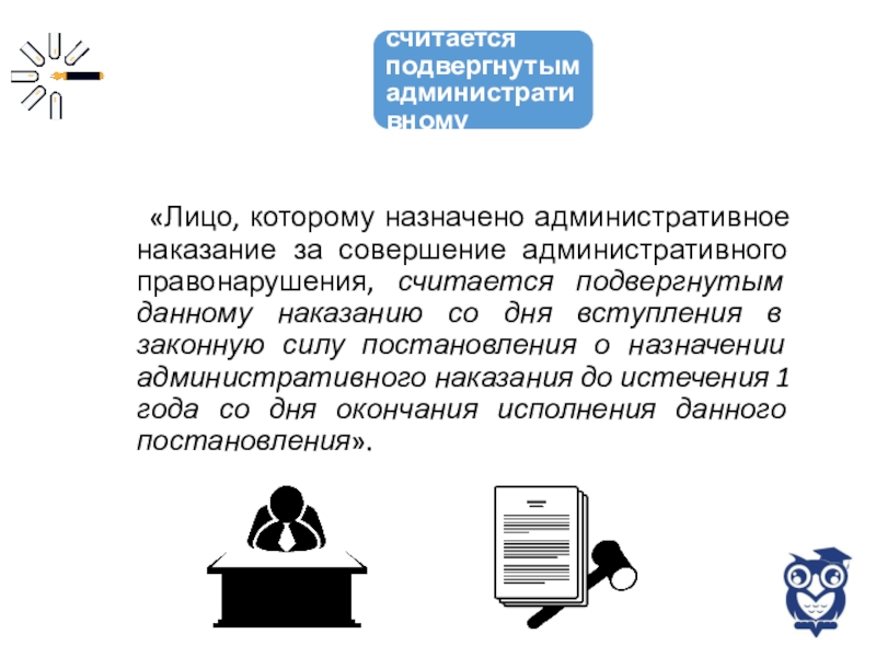 Слайд 27«Лицо, которому назначено административное наказание за совершение административного правонарушения, считается подвергнутым