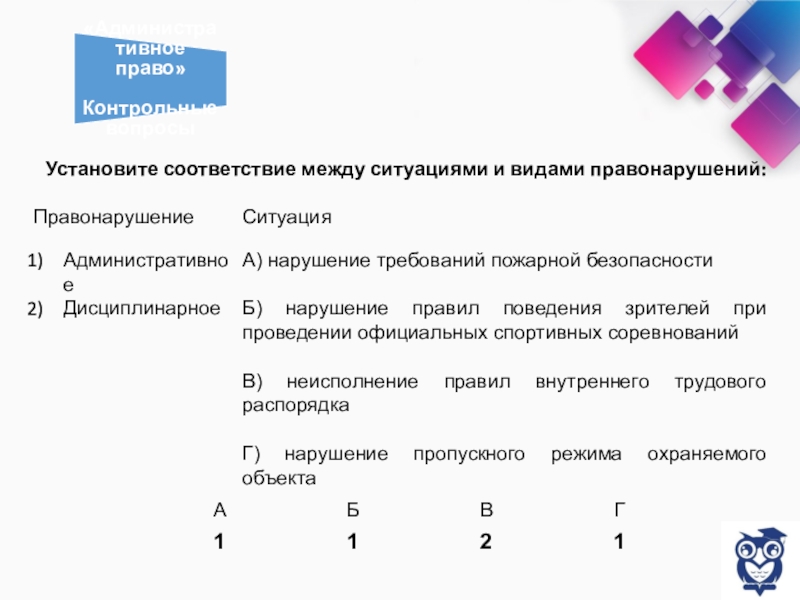 Слайд 42 Установите соответствие между ситуациями и видами правонарушений: