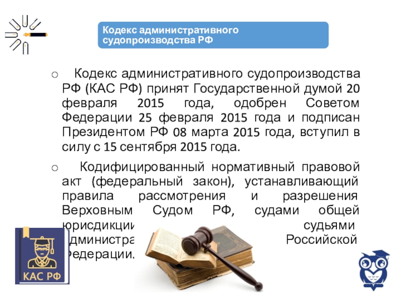 Слайд 16 Кодекс административного судопроизводства РФ (КАС РФ) принят Государственной думой