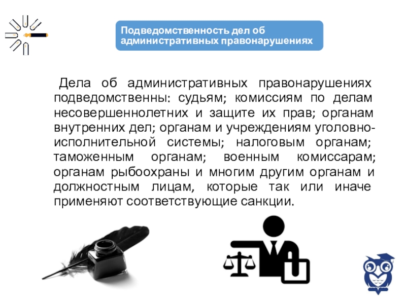 Слайд 29Дела об административных правонарушениях подведомственны: судьям; комиссиям по делам несовершеннолетних и