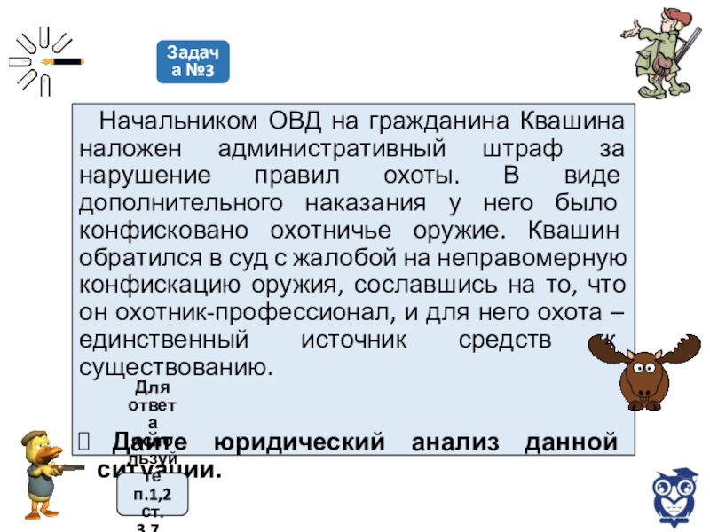 охоты. В виде дополнительного наказания у него было конфисковано охотничье оружие. Квашин обратился в суд с жалобой на неправомерную конфискацию оружия, сославшись на то, что он охотник-профессионал, и для него охота – единственный источник средств к существованию.