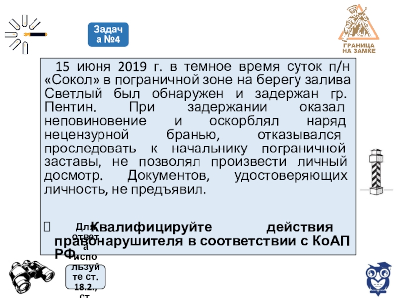пограничной зоне на берегу залива Светлый был обнаружен и задержан гр. Пентин. При задержании оказал неповиновение и оскорблял наряд нецензурной бранью, отказывался проследовать к начальнику пограничной заставы, не позволял произвести личный досмотр. Документов, удостоверяющих личность, не предъявил.