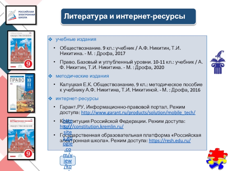 Калуцкая Е.К. Обществознание. 9 кл.: методическое пособие к учебнику А.Ф. Никитина, Т.И. Никитиной. - М. : Дрофа, 2016