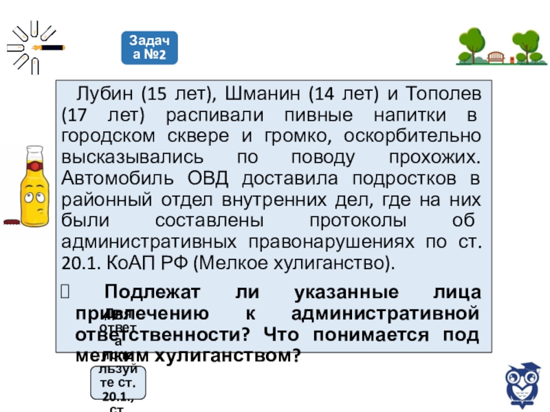 пивные напитки в городском сквере и громко, оскорбительно высказывались по поводу прохожих. Автомобиль ОВД доставила подростков в районный отдел внутренних дел, где на них были составлены протоколы об административных правонарушениях по ст. 20.1. КоАП РФ (Мелкое хулиганство).