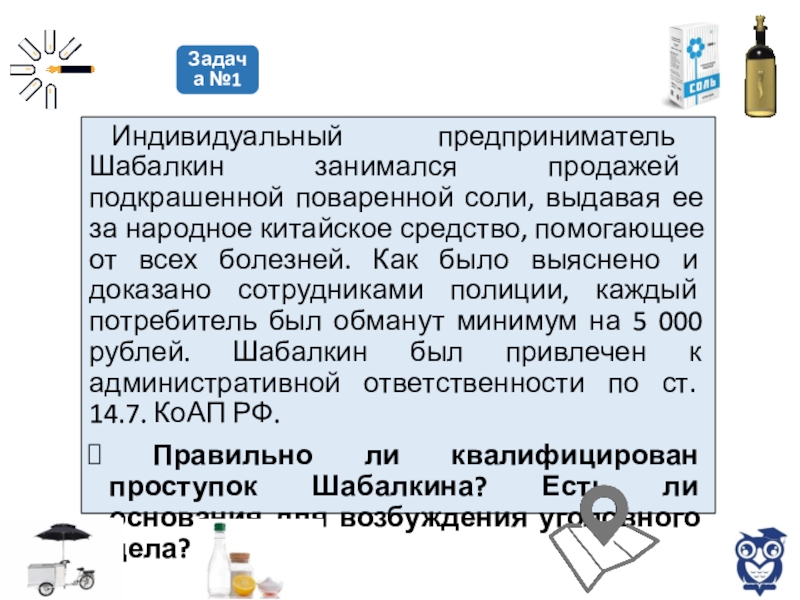 Слайд 32Индивидуальный предприниматель Шабалкин занимался продажей подкрашенной поваренной соли, выдавая ее за