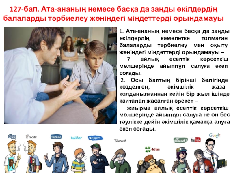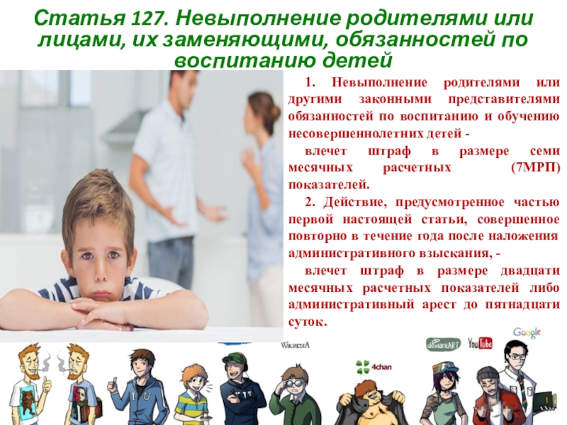 127-бап. Ата-ананың немесе басқа да заңды өкiлдердiң балаларды тәрбиелеу жөнiндегi мiндеттердi орындамауы