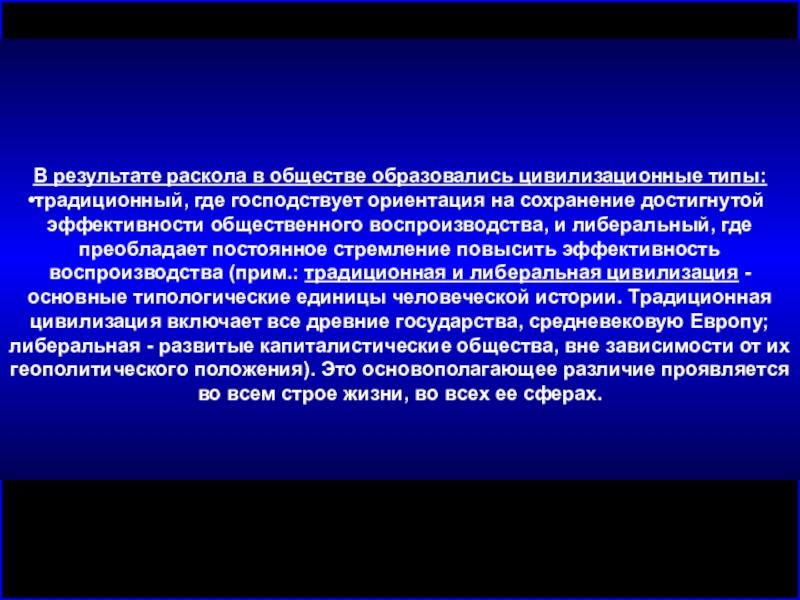 господствует ориентация на сохранение достигнутой эффективности общественного воспроизводства, и либеральный, где преобладает постоянное стремление повысить эффективность воспроизводства (прим.: традиционная и либеральная цивилизация - основные типологические единицы человеческой истории. Традиционная цивилизация включает все древние государства, средневековую Европу; либеральная - развитые капиталистические общества, вне зависимости от их геополитического положения). Это основополагающее различие проявляется во всем строе жизни, во всех ее сферах.