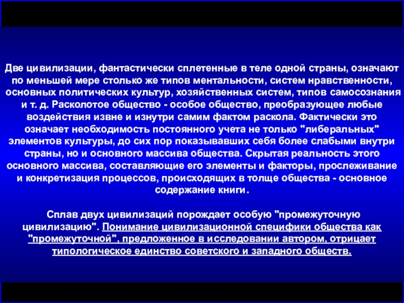 Сплав двух цивилизаций порождает особую "промежуточную цивилизацию". Понимание цивилизационной специфики общества как "промежуточной", предложенное в исследовании автором, отрицает типологическое единство советского и западного обществ.