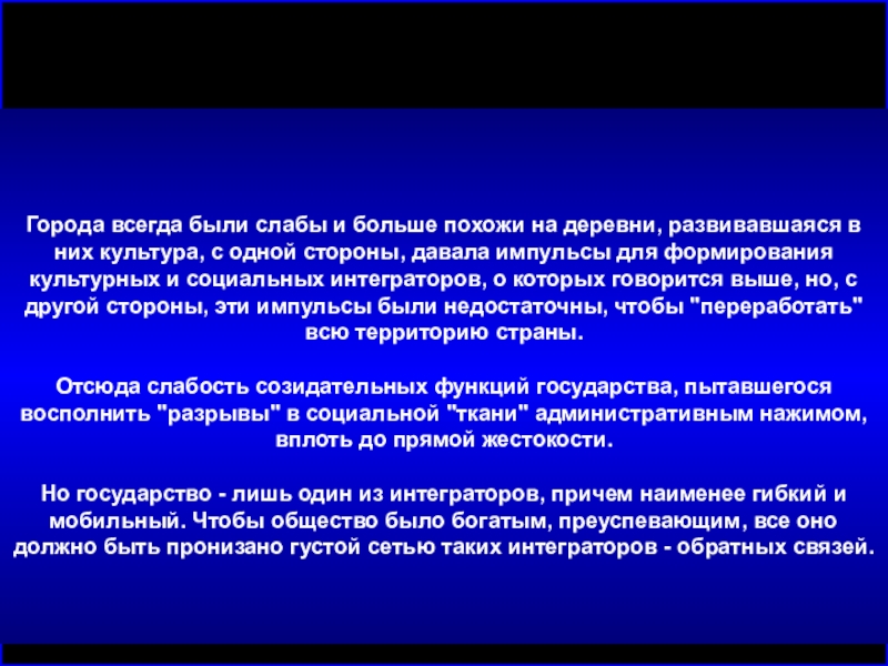 Отсюда слабость созидательных функций государства, пытавшегося восполнить "разрывы" в социальной "ткани" административным нажимом, вплоть до прямой жестокости.