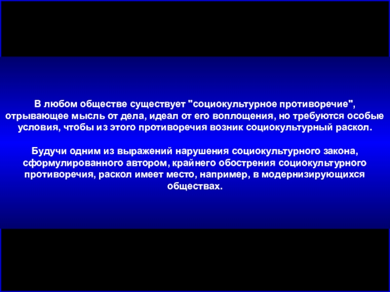 Будучи одним из выражений нарушения социокультурного закона, сформулированного автором, крайнего обострения социокультурного противоречия, раскол имеет место, например, в модернизирующихся обществах.
