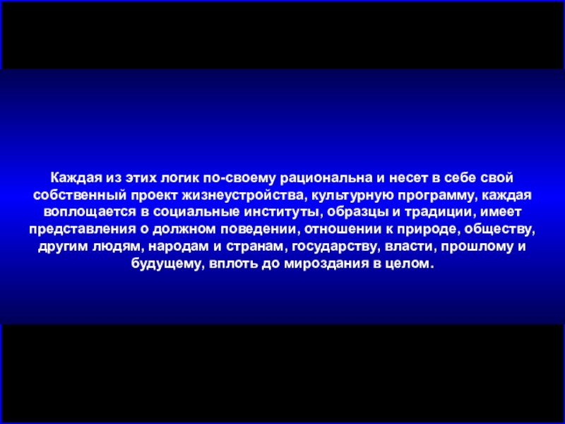 собственный проект жизнеустройства, культурную программу, каждая воплощается в социальные институты, образцы и традиции, имеет представления о должном поведении, отношении к природе, обществу, другим людям, народам и странам, государству, власти, прошлому и будущему, вплоть до мироздания в целом.