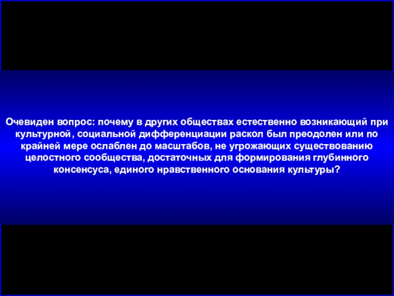 дифференциации раскол был преодолен или по крайней мере ослаблен до масштабов, не угрожающих существованию целостного сообщества, достаточных для формирования глубинного консенсуса, единого нравственного основания культуры?