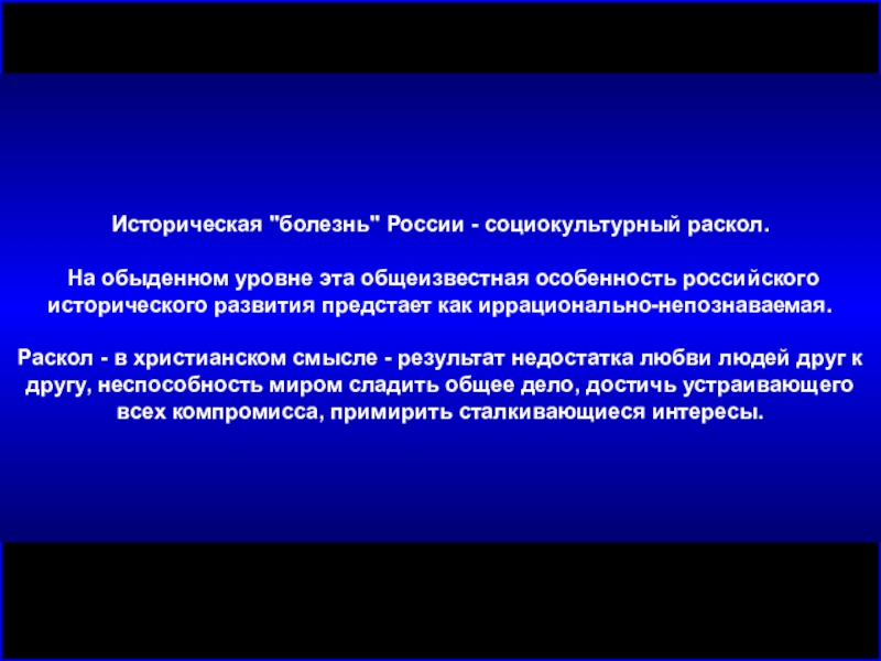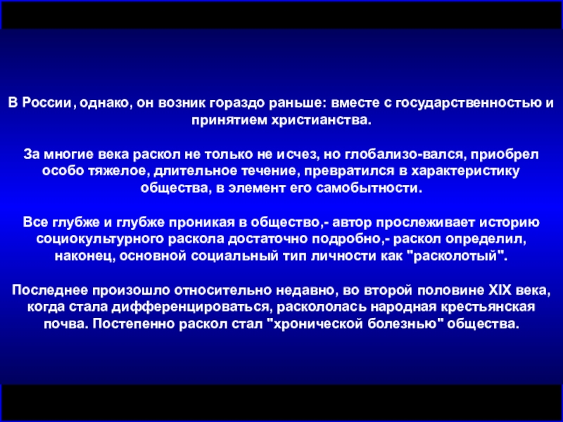 За многие века раскол не только не исчез, но глобализо-вался, приобрел особо тяжелое, длительное течение, превратился в характеристику общества, в элемент его самобытности.