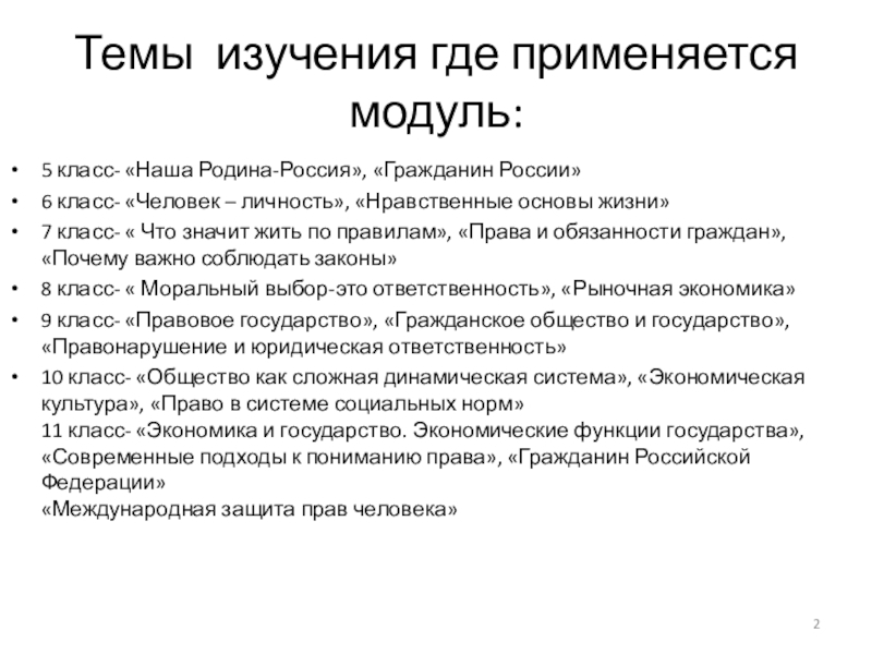 Темы изучения где применяется модуль:5 класс- «Наша Родина-Россия», «Гражданин России»6 класс- «Человек – личность», «Нравственные основы жизни»7 класс- « Что значит жить по правилам», «Права и обязанности граждан», «Почему важно соблюдать законы»8 класс- « Моральный выбор-это