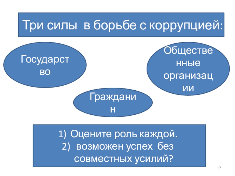 ГосударствоГражданинОбщественные организацииТри силы в борьбе с коррупцией: Оцените роль каждой. возможен успех без совместных усилий?