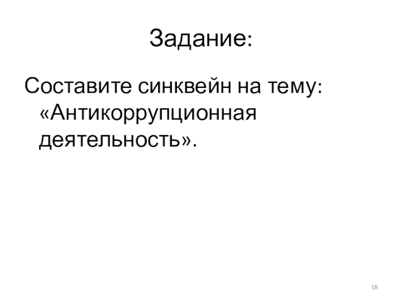 Задание:Составите синквейн на тему: «Антикоррупционная деятельность».