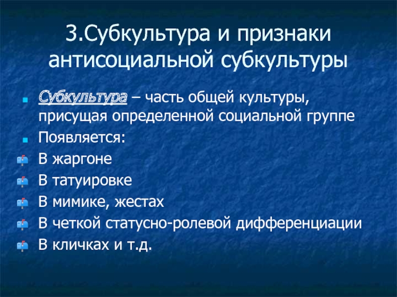 Слайд 113.Субкультура и признаки антисоциальной субкультуры