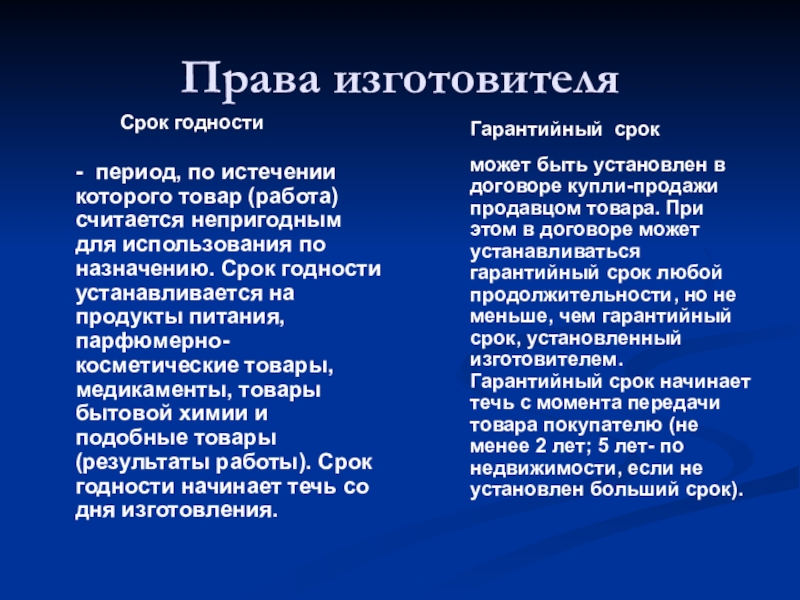 может быть установлен в договоре купли-продажи продавцом товара. При этом в договоре может устанавливаться гарантийный срок любой продолжительности, но не меньше, чем гарантийный срок, установленный изготовителем. Гарантийный срок начинает течь с момента передачи товара покупателю (не менее 2 лет; 5 лет- по недвижимости, если не установлен больший срок).