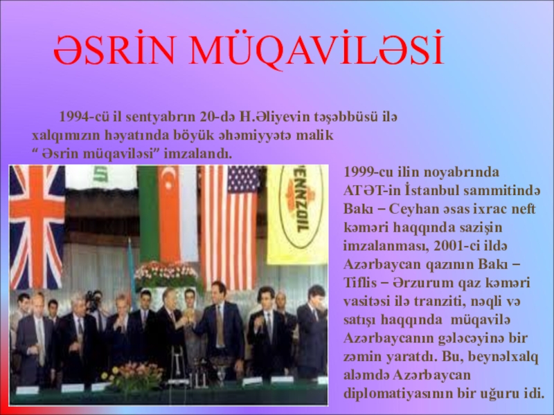 1999-cu ilin noyabrında ATƏT-in İstanbul sammitində Bakı – Ceyhan əsas ixrac neft kəməri haqqında sazişin imzalanması, 2001-ci ildə Azərbaycan qazının Bakı – Tiflis – Ərzurum qaz kəməri vasitəsi ilə tranziti, nəqli və satışı haqqında müqavilə Azərbaycanın gələcəyinə bir zəmin yaratdı. Bu, beynəlxalq aləmdə Azərbaycan diplomatiyasının bir uğuru idi.