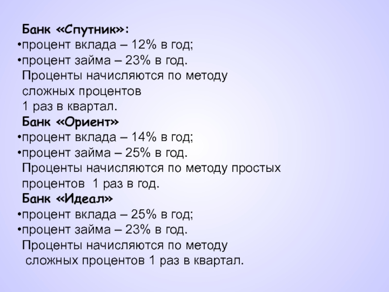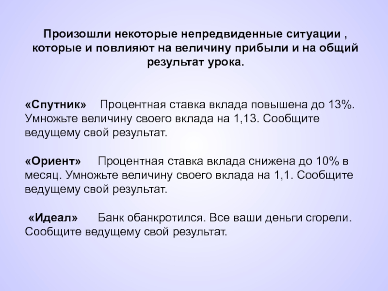 «Ориент» Процентная ставка вклада снижена до 10% в месяц. Умножьте величину своего вклада на 1,1. Сообщите ведущему свой результат.