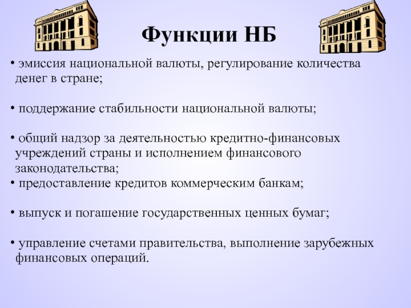 эмиссия национальной валюты, регулирование количества денег в стране;