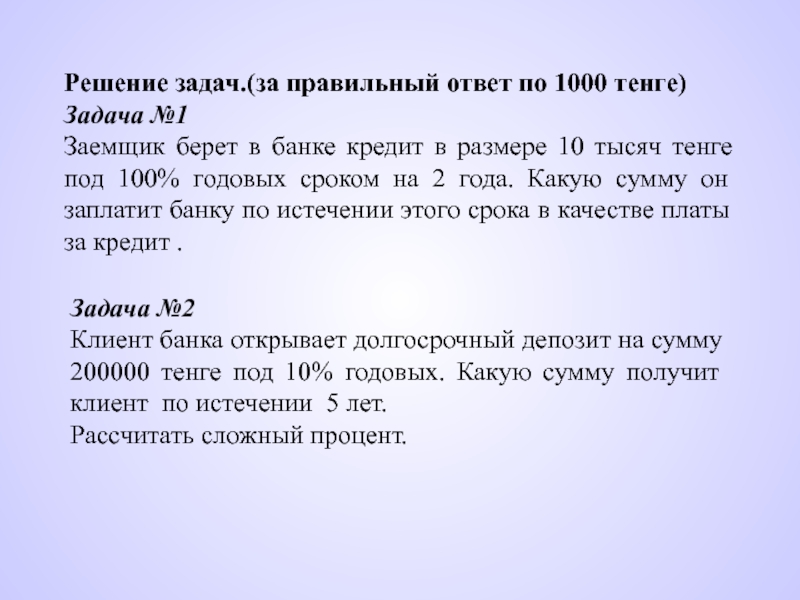 Слайд 22Решение задач.(за правильный ответ по 1000 тенге)
