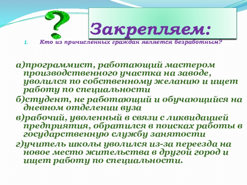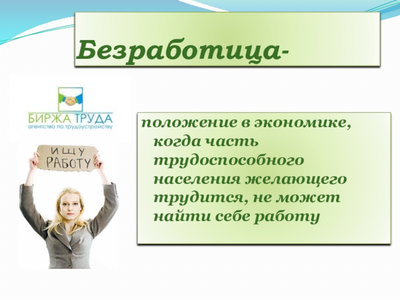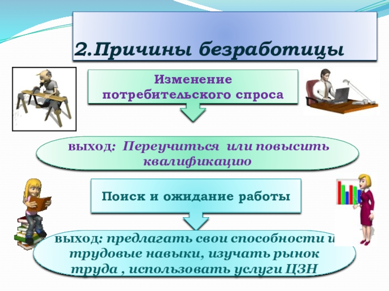выход: предлагать свои способности и трудовые навыки, изучать рынок труда , использовать услуги ЦЗН