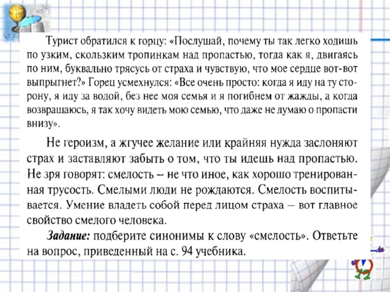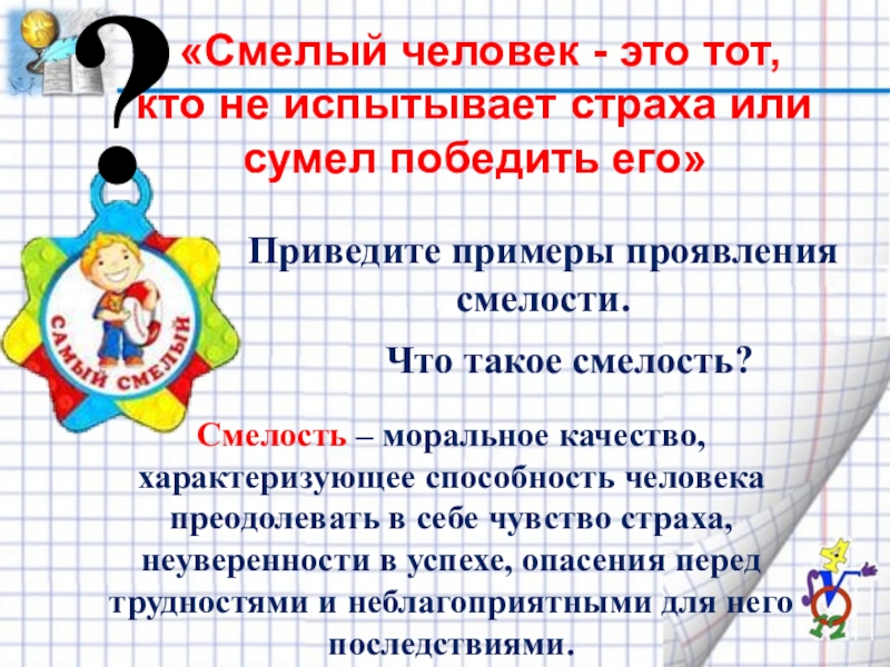 Смелость – моральное качество, характеризующее способность человека преодолевать в себе чувство страха, неуверенности в успехе, опасения перед трудностями и неблагоприятными для него последствиями.