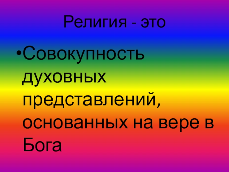 Религия - этоСовокупность духовных представлений, основанных на вере в Бога