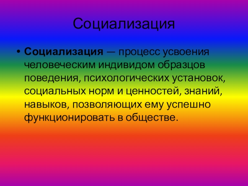 Социализация — процесс усвоения человеческим индивидом образцов поведения, психологических установок, социальных норм