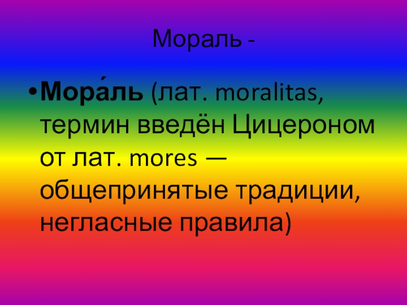 Мораль -Мора́ль (лат. moralitas, термин введён Цицероном от лат. mores — общепринятые традиции, негласные правила)