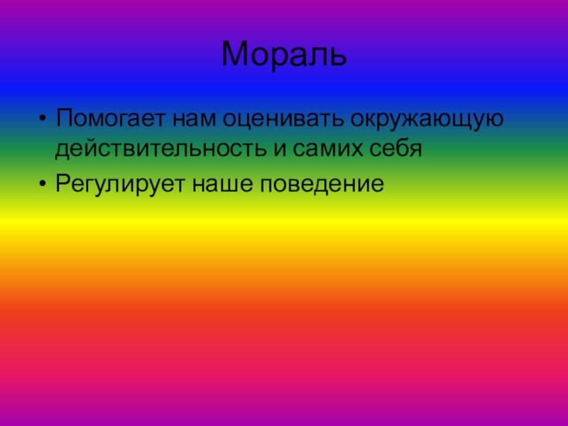 МоральПомогает нам оценивать окружающую действительность и самих себяРегулирует наше поведение