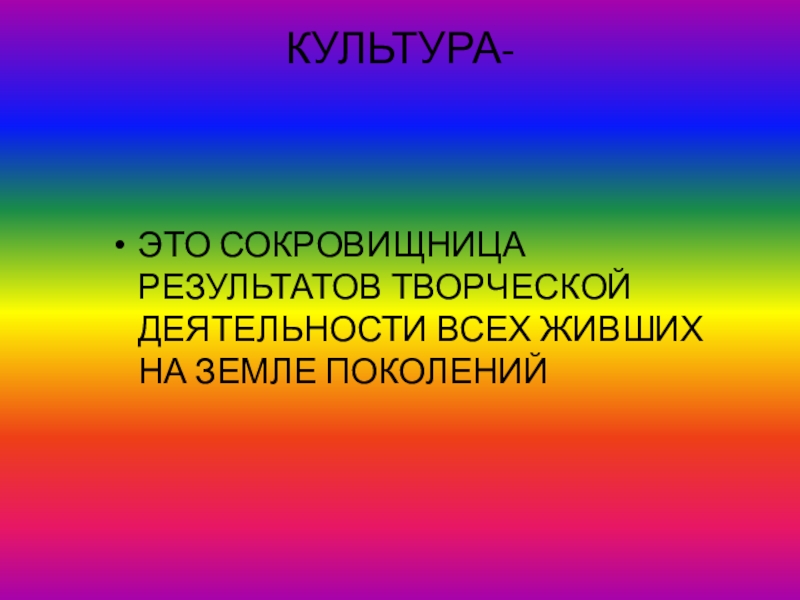 КУЛЬТУРА- ЭТО СОКРОВИЩНИЦА РЕЗУЛЬТАТОВ ТВОРЧЕСКОЙ ДЕЯТЕЛЬНОСТИ ВСЕХ ЖИВШИХ НА ЗЕМЛЕ ПОКОЛЕНИЙ