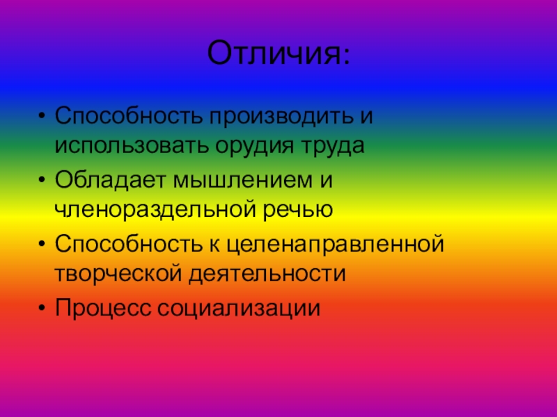 Отличия:Способность производить и использовать орудия трудаОбладает мышлением и членораздельной речьюСпособность к целенаправленной творческой деятельностиПроцесс социализации