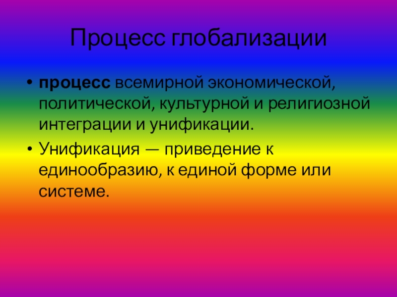 Процесс глобализациипроцесс всемирной экономической, политической, культурной и религиозной интеграции и унификации.Унификация — приведение к единообразию, к единой форме