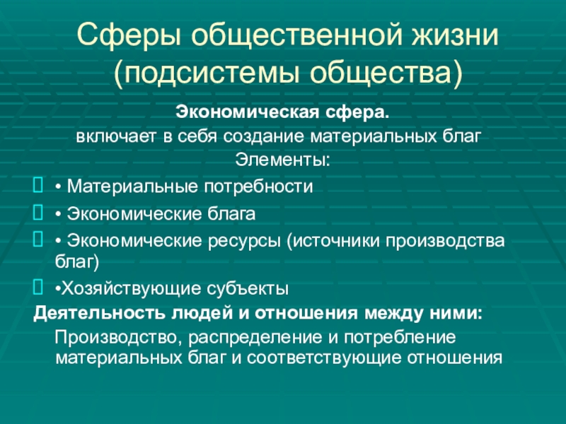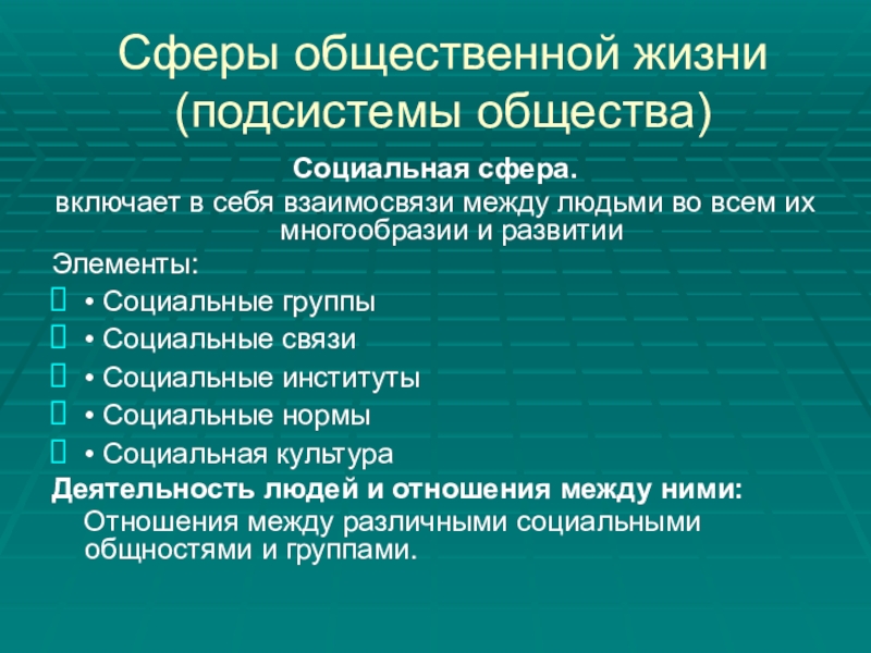 Слайд 13Сферы общественной жизни (подсистемы общества)